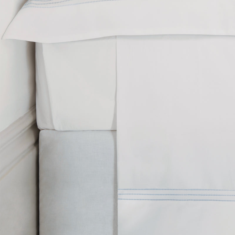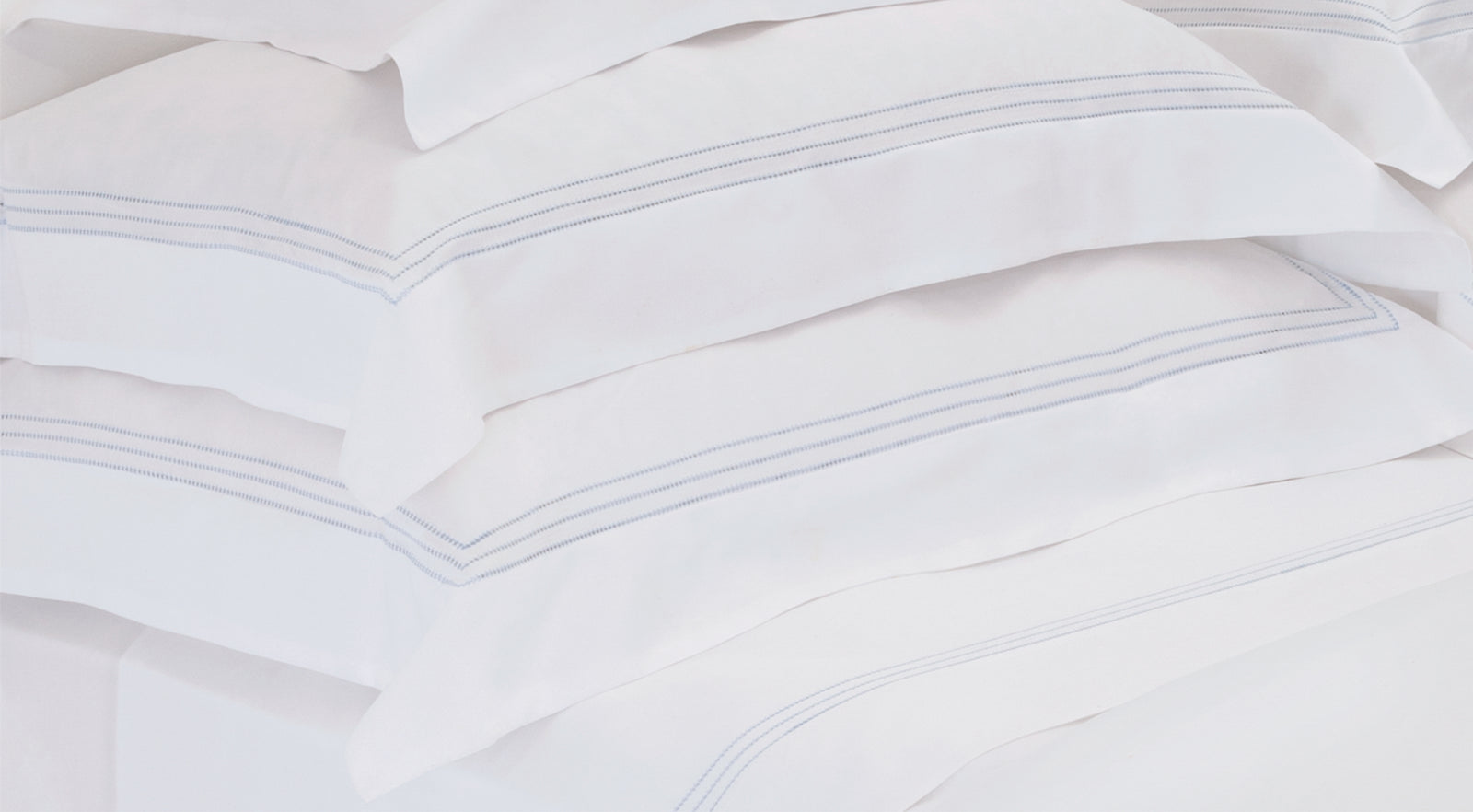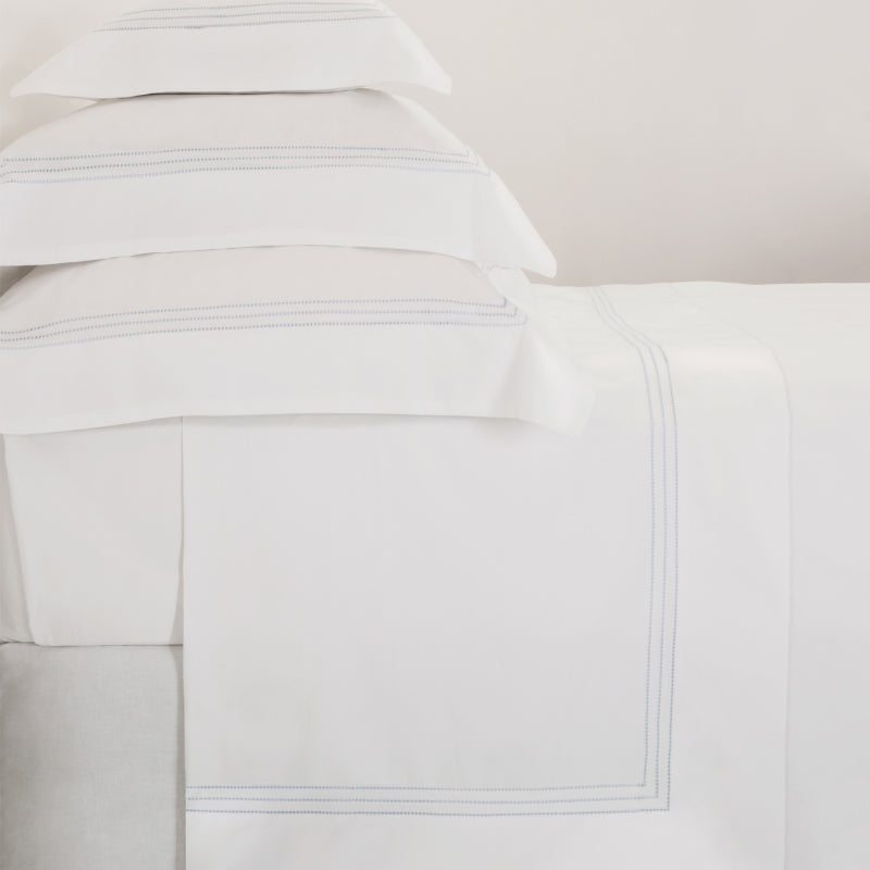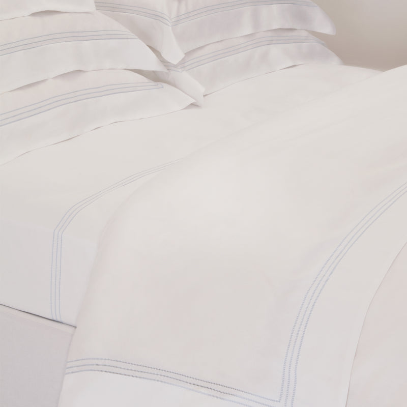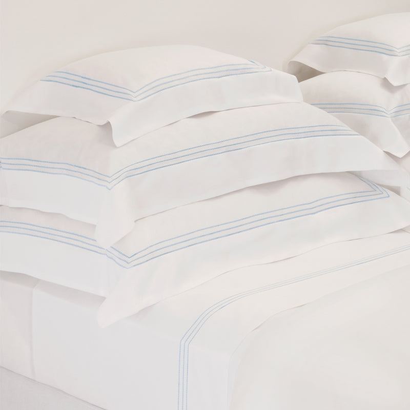 Tailored with a triple Ajour embroidered trim, and border, the Angela bed linens are available in 100% fine Italian linen, mercerised combed 100% cotton in sateen and percale weaves.